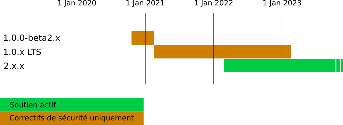 Cette façon de procéder à l'avantage de proposer une version fonctionnelle et stable pour la création de site web sur les 2 prochaines années, mais a le désavantage de ne plus apporter de nouvelles fonctionnalités. Cette version LTS n'apportera que des corrections de bug et sécurité.
